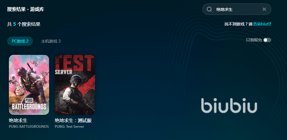 biubiu软件就是实惠好用加速器的典范,每个月只要花很少的钱就能使用,大学生最低每天只要0.3元。而新用户注册后还能立即获得24小时免费体验,限免体验也可以加速全平台游戏,找到绝地求生以后就能马上加速了。
