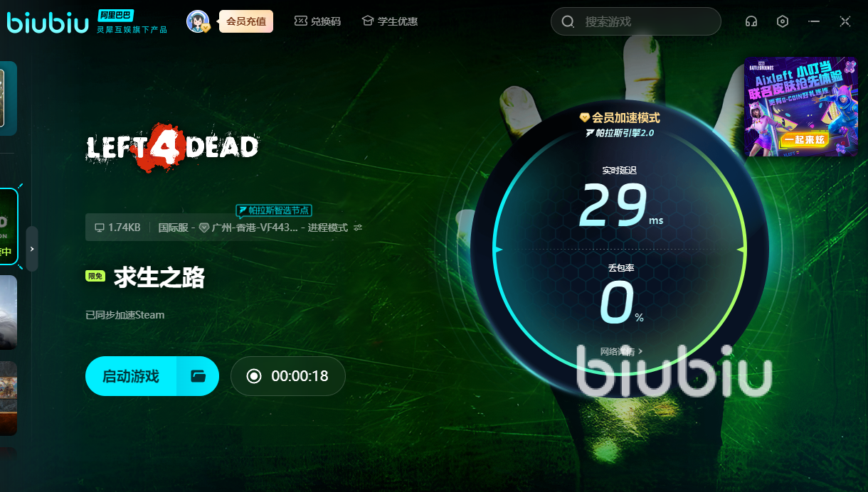 求生之路目前暂时没上线国服,所以我们想进入其他区域的邪恶都市。就得借助biubiu,在他的强大提速能力下,才有机会接触新的求生之旅。对于新用户的话,可以领取24小时的免费加速。另外新老用户输入【biubiu不卡顿】,便可额外获得三天免费加速。如果面对僵尸的围攻时卡顿,我们就很难突破包围圈。唯有用上加速器后,才能快速突破围堵,杀出一条血路。