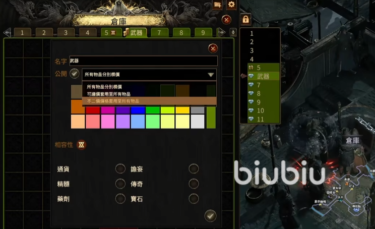 买完之后,我们打开属性栏,找到仓库页,将其进行命名,然后选择进行公开,这样在里面放置的道具,就可以进入售卖状态了。
