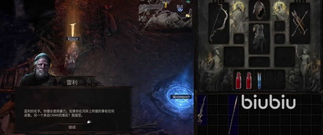 在打完这里的小怪之后,我们找到地图上的航点,也就是蓝色图标的位置,旁边我们会遇到第一个npc叫做Renly。其实游戏都是英文版本的,小编贴心的为大家翻译成了中文,不过能力有限,可能会有不太准确的地方,大家请多包涵。