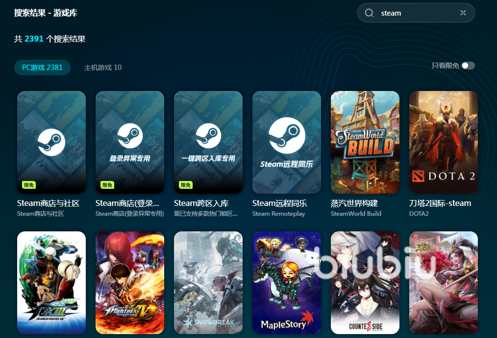 当下我们来试试看它对于平台的服务效果如何吧,客户端的右上部分就是搜索专用框了,在这里我们可以进行对任何游戏以及平台的查找,动动键盘跟鼠标查下,就可以看到加速页面了。