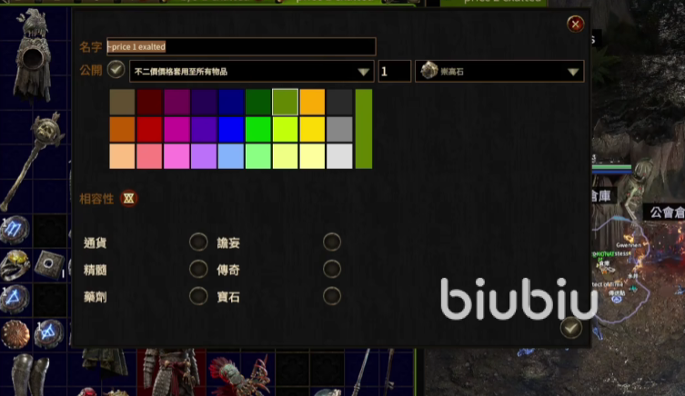 切回到游戏,我们点开仓库就可以看到增加了列表,接着能把自己拥有的道具放进去,最好是分类放置,然后将仓库改成对应的名称,方便自己后期整理商店。最后就是对自己的商品进行定价了,记的在公开栏选取不二价格套用至所有物品,不然一样的东西直接自动标一样的价格,有些属性好的装备就卖亏了。