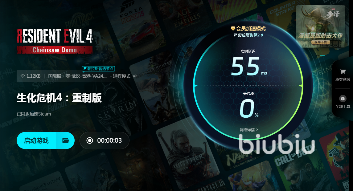 四代生化危机重置版相比于三代,大幅度删减了原作中的内容,拥有16个章节,提供将近15小时游戏体验时间。虽然对于原版有所删节,但是加入了属于重制版独有玩法,这将既保留了元素精髓内容,又可以更好地展现现代玩家需求。在制作方面绝对能称得上是成功的重置制作。但是很多玩家反映,即使是现在运行游戏,依然容易出现加载慢的情况,还有很多玩家反映在和大规模丧尸战斗时容易出现卡顿,其实这都和网速有着一定关系。解决方法可以先不去更新硬件,下载一个biubiu,然后在里面运行游戏就能够搞定了。至于操作方法就是直接输入游戏名称,然后查找选项进行一键操作。