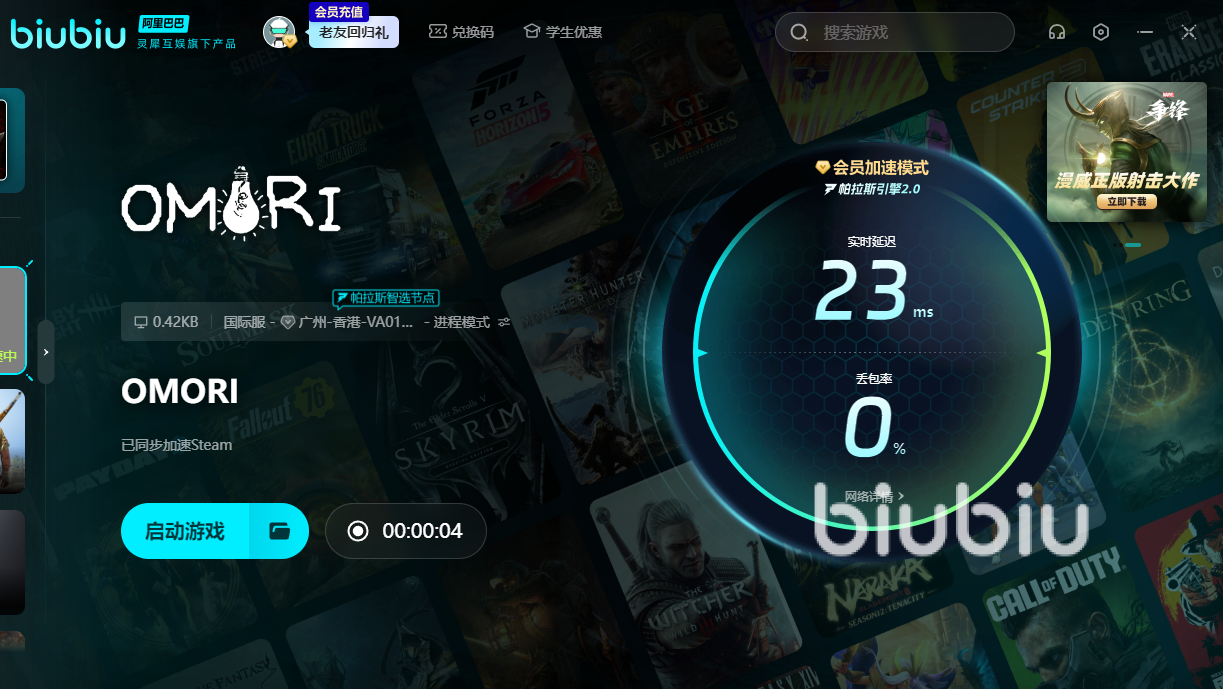OMORI作为一款风靡全球的海外大作,所以他暂时仍然没有上线过。要是想要化身为恐怖世界中的一员,就得先使用biubiu。提速后,方可继续在这恐怖世界中努力挣扎下去。新用户的话可以领取24小时的免费加速,另外新老用户键入【biubiu不卡顿】,便可额外领取三天免费加速。若是闯关途中过卡的话,很有可能被突如其来的鬼怪袭击。这时用上加速器后,方能解决卡顿难题,让你有自保的能力。