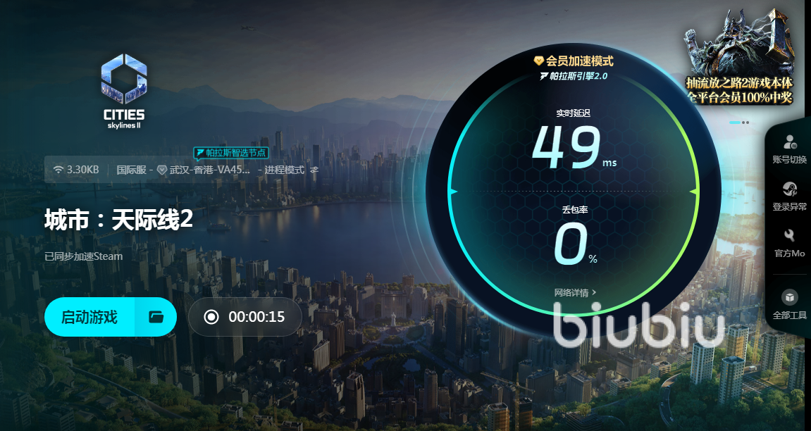 诸位之前还没有使用过biubiu的用户,现在就可以直接拿出手机号注册biubiu账号登录进来,目前最新注册账号赠送24小时的福利依然有效。加入进来之后直接搜索城市天际线2,找到相关选项后,点击就能一键优化开启,明显地感受到在优化之后,加载速度变快了很多。游戏过程中进行界面切换时候也变得非常流畅,这是因为biubiu利用自身专线连接技术,实现了数据快速流畅交换。还有其他多项技术应用,缩短了数据交换流程,所以使得玩家在游戏里反应能够加速很多。该游戏真正到了后期城市建设接近尾声时候,庞大数据几乎令很多设备都难以流畅运行,有了biubiu之后,这些都能获得优化。