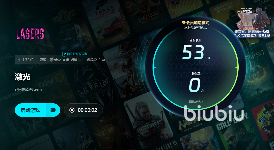 激光这款游戏其实对玩家的延迟有着很高要求,在很多高难度关卡中,虽然自身已经做出了动作,但是如果没有延迟做保障,也无法使角色做出正确应对,这时就有可能遗憾被淘汰。在关键时刻出现这样情况,绝对很令人头疼。Biubiu就可以利用自身专线,帮助实现连接,一键操作之后直接就通过专线连上服务器到客户端,这样数据在专线之间传输非常顺畅。即使是玩家想要去海外服玩耍,也可以直接在这里切换成不同的服,同样拥有海外专线,保证数据正常传输,也就意味着延迟可以在很低水平下,这样拥有利于玩家做出各种机动动作。