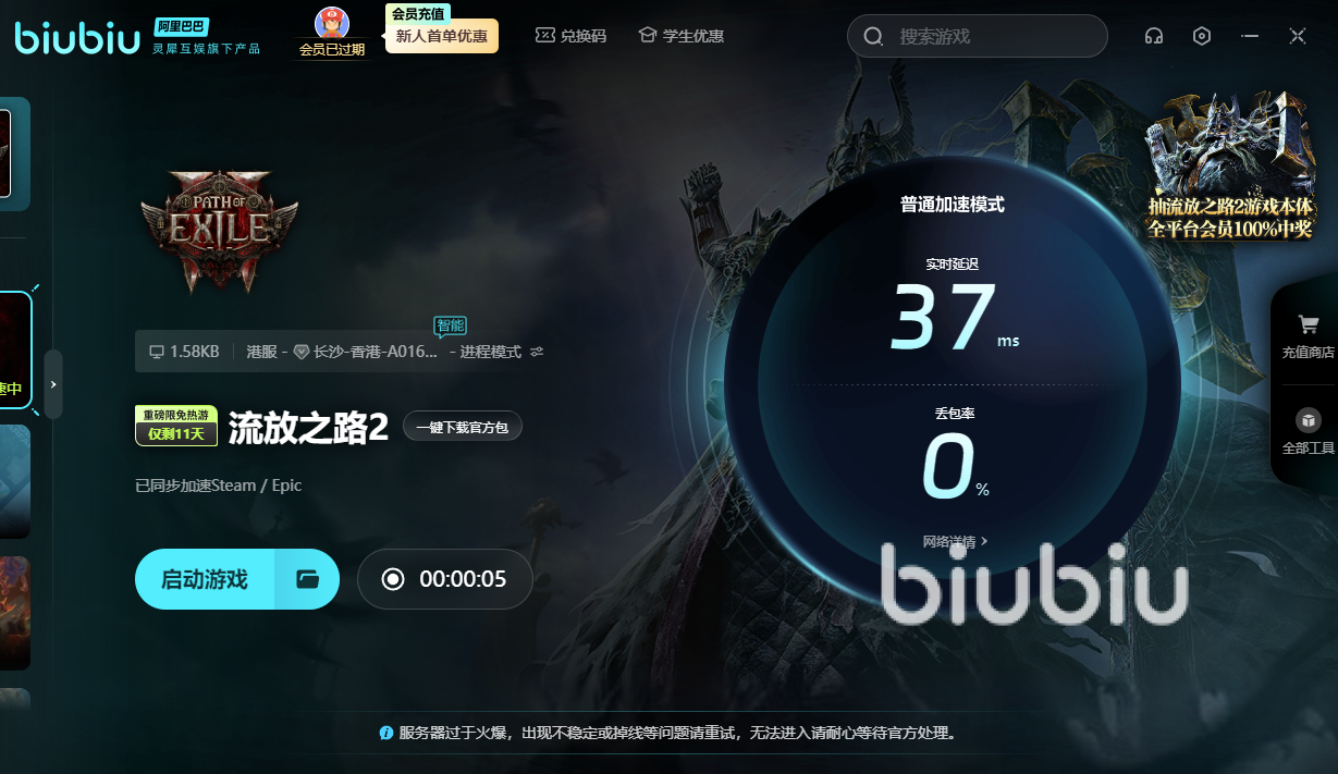 这款工具同时还为我们提供了丰富的福利活动,如新账号免费试用、兑换加速时长等。目前流放之路程2在这款软件上可以进行免费体验加速+抽奖,时间从12月7号至20号。另外新用户可以通过免费试用24小时体验加速器的卓越性能,而通过【biubiu不掉线】还可换取72小时的加速时长,两者加起来共96小时呢。