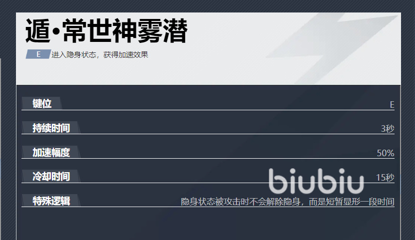 该角色还有一定的隐身能力,可以潜伏到敌人附近进行攻击,使用E技能遁·常世神雾潜就可以了,在隐身状态下,我们还可以获得加速效果哦,一般用来突进到敌人身后进行攻击。