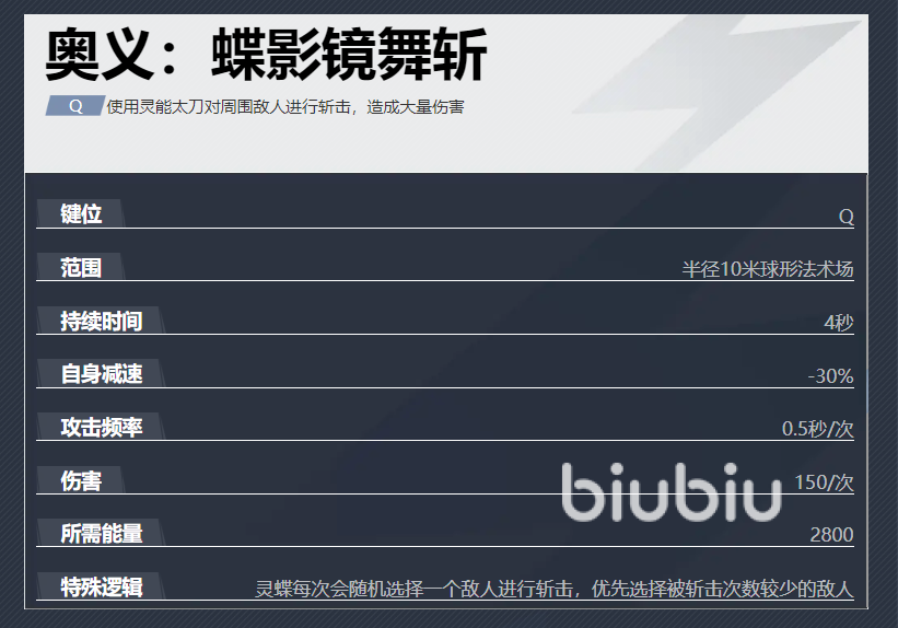 Q技能是奥义:蝶影镜舞斩,武器切换成为灵能太刀,可以对周围的敌人进行斩击,整体伤害值很高,距离还是周身的半径10米的球形区域。技能带有特殊逻辑,会优先命中被斩击次数小的角色,等于是一个压血线的技能。