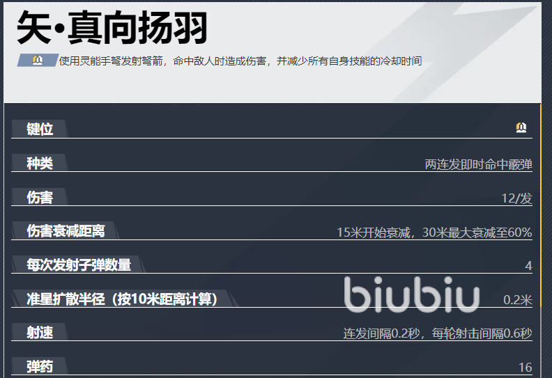首先看下她的普通攻击,矢·真向扬羽,可以使用灵能手弩来攻击,发生的弩箭命中敌人造成伤害,同时自身的技能冷却时间是会得到减少的。另外如果两连发能够即时命中会有霰弹效果的。