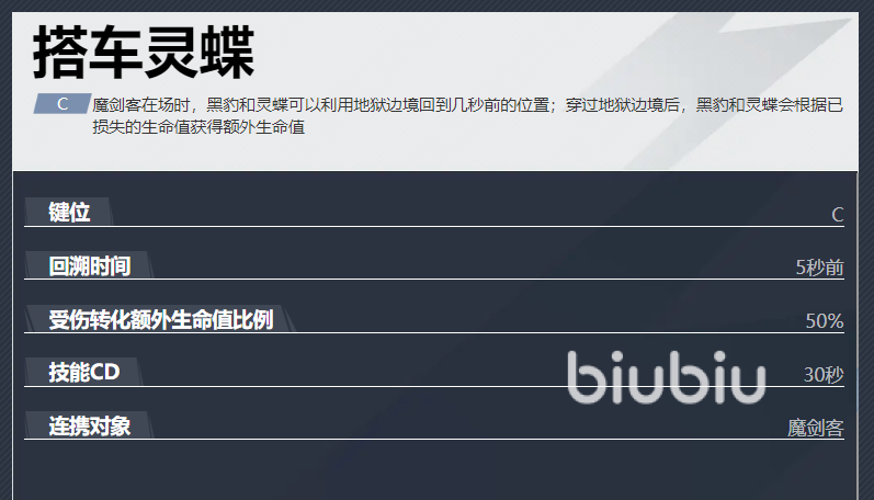 连携技能搭车灵蝶是需要跟队友配合使用的,只有在魔剑客在场的时候,我们才可以利用地狱边境回到几秒前的位置,并且回复已经损失的生命值,以及获得额外生命值,等于是一个回血技能。