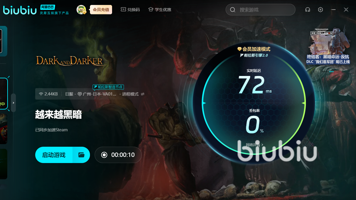 越来越黑暗属于国际性大作,所以目前暂时没有上线国服。为了进入黑暗的地牢中,我们要借助biubiu强大的加速能力。它会被魔法阵传送至全新的黑暗世界中,让你成为勇者,开启挑战。新用户的话可领取24小时的免费加速,另外新老用户输入【biubiu不卡顿】,即可额外畅享三天免费加速。如果在寻找线索和道具时太卡,就可能会被黑暗生物发现并将我们解决。采用加速器以后,才能稳妥地开启战斗,并避免被对方消灭。