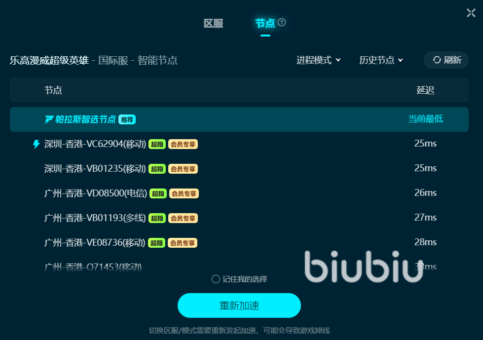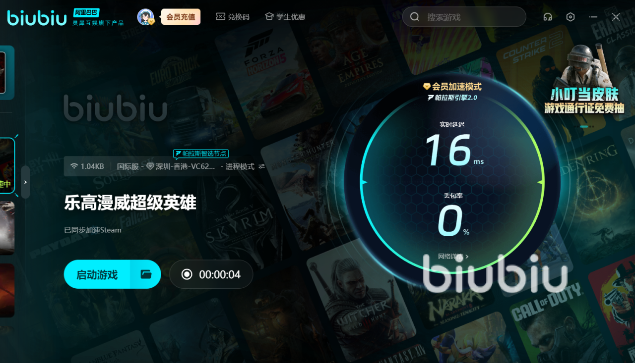 在加速页面,玩家可以清楚地看到加速后的网络数据,包括延迟和丢包率等具体信息。此外,BIUBIU的智能监测功能会自动切换到不拥堵节点。