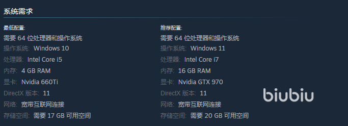 为了满足基本的游戏运行需求,玩家的电脑需要至少配备GTX 660Ti(DX11)显卡,i5 SandyBridge系列的CPU,4GB的内存,以及支持DX11的Wind10操作系统,在这样的硬件支持下,游戏可以以720p的分辨率和低特效运行,虽然能够启动游戏,但可能无法提供最佳的游玩体验,特别是在画面的效果以及流畅度方面。