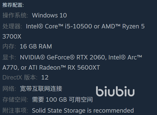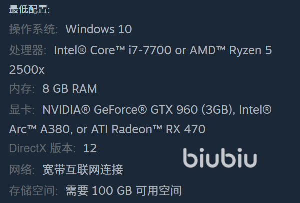 另外运行最少需要8GB的内存容量,当然也可以考虑留出16千兆字节的空间来增强画质方面的感受。显卡方面要求就稍高一些了,需要中高端像GTX 960 、A380 或基于GCN 4.0架构的RX 470等,都是最低要求,而光追2060、A770 可以能够提供更出色的图形处理能力,呈现出更细腻、逼真的游戏画面。