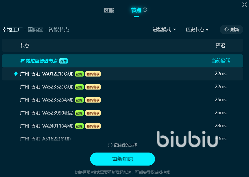 Biubiu专业团队开发了先进的智能节点推荐系统,能够自动匹配本地电脑与该作品的服务器之间的最佳节点,有效减少玩家在选择节点时的困扰。不过,对于少数网络状况较差或游戏本身具有特殊性的用户,自动推荐的节点可能无法提供最佳的加速效果。此时,手动选择节点可能会带来更好的体验,进一步享受更优质效果,历史选择过的选项还能储存记忆,贴心地为你下一次快速启动。