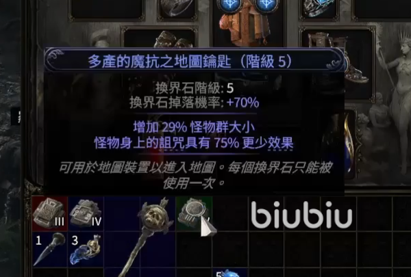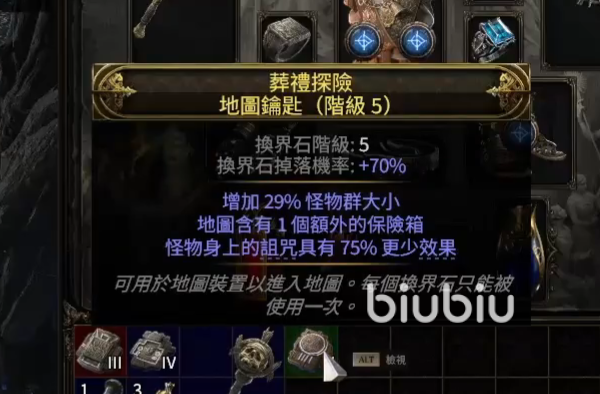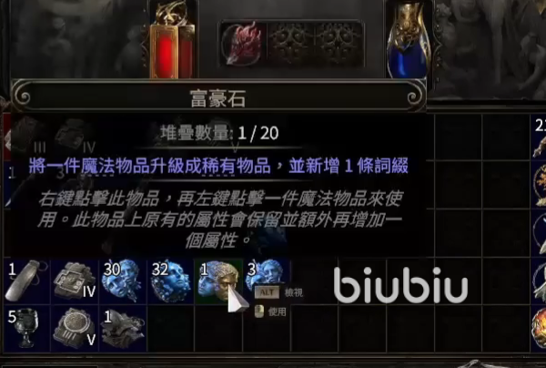 它最主要的用途之一就是提升物品的品质,而品质又直接影响其基础属性的数值范围。比如我们打到一把地图钥匙,一开始它是蓝色品质的魔法属性,当我们右击富豪石,再左击这把钥匙。那么它就会变成金色品质的,同时还会在地图中多增加一个保险箱,这也就意味中这张地图中的奖励变得更加的丰富。