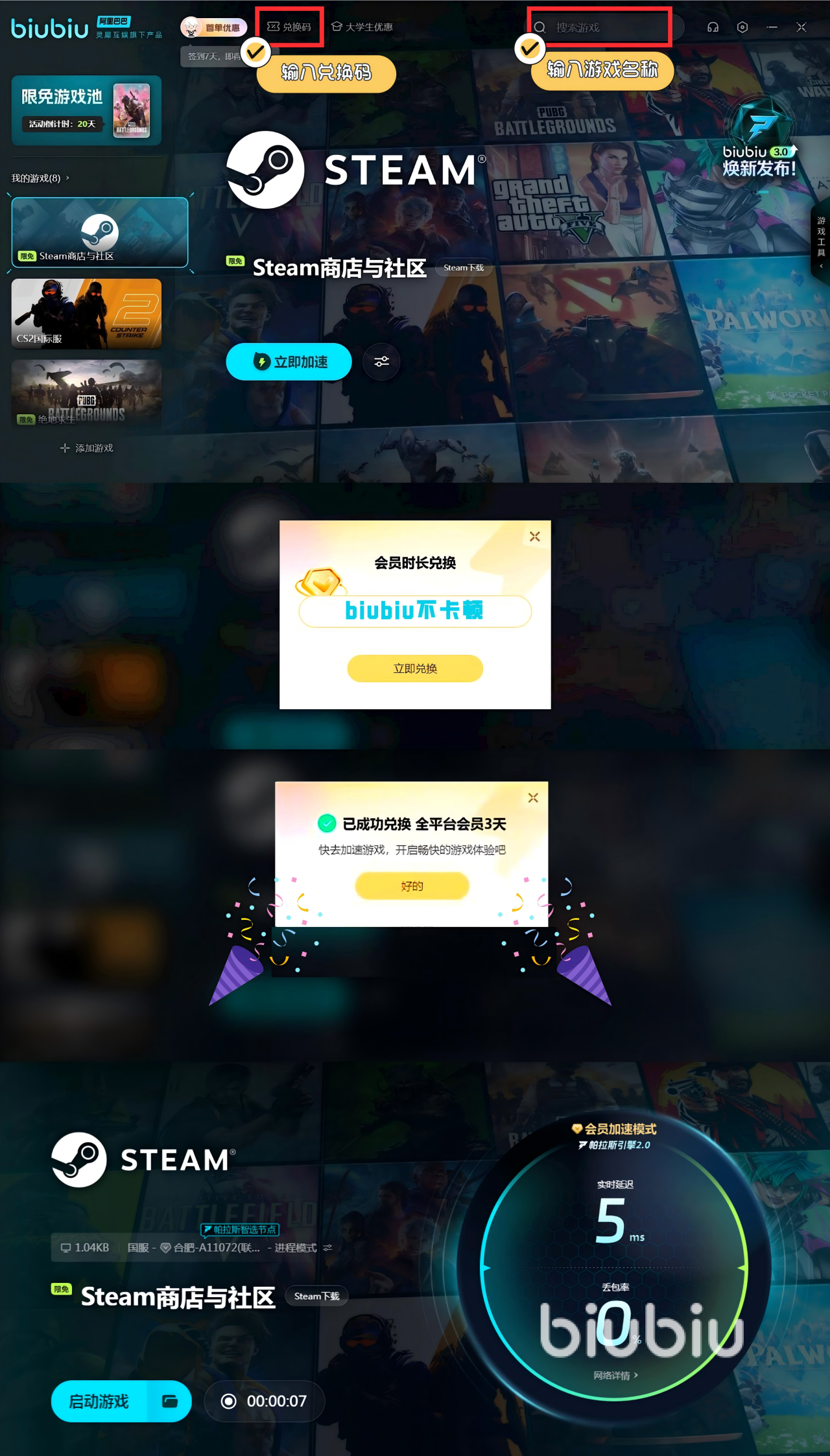 介绍完这些,还有个重磅戏告诉大家,那就是biu仔对于Steam是提升下载速度效果的,大家在购入多款折扣商品之后,肯定是要下载的,这时候用上速度飞快。现在新人用还可以得到免费的24h时间用哦,另外biu仔还开放了【biubiu不卡顿】这个码,新老用户都拿去换72h吧,得到的就是96h了。