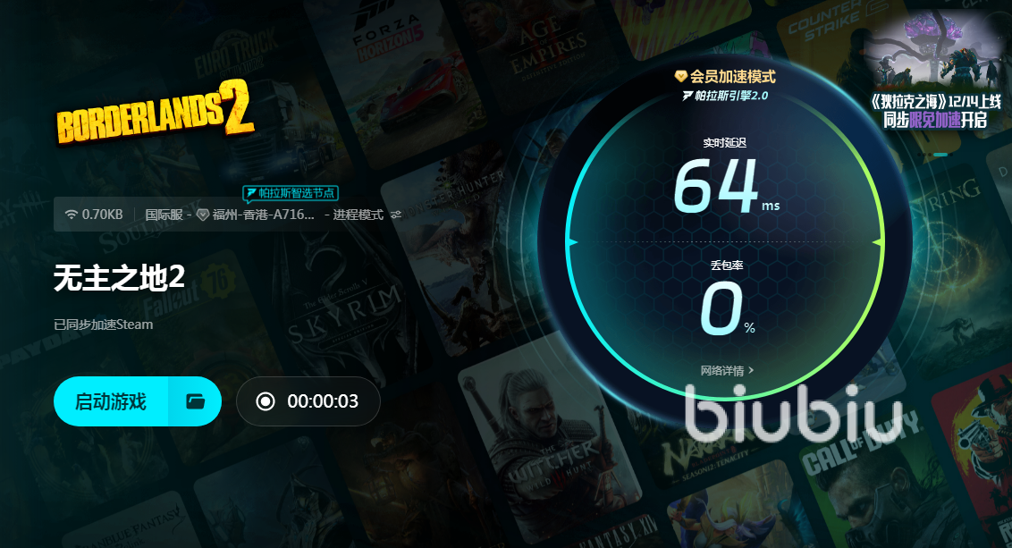 无主之地2拥有非常鲜明废土朋克风格,打造画风极具辨识,在这样荒诞和狂野的世界中冒险,绝对有着非常出色体验。现在需要解决的是经常出现卡加载界面问题,使用biubiu之后就能够很好地避免这样情况发生。现在biubiu新账号有24小时加速时间免费赠送福利,所以注册一个新号,打开之后就能直接使用,这样新人就能先免费尝试一下。例如输入无主之地2后,找到选项进行一键加速,就可以进入游戏中运行了,不需要再进行其他设定,操作简单且性能优异。因为自身有着诸多先进技术,能够从各个方面来提供保障。出现卡加载或者是其他卡顿情况,本质上就是因为数据出现堵塞缘故,biubiu拥有自身专线,所以这些都能够很好地解决。