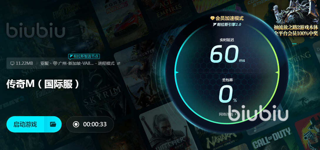 想要获得更多的加速时长,大家还可以领用 【biubiu不卡顿】这个兑换码,它赠送的是3天免费加速。就拿传奇M来说,大家找到游戏以后直接一键启动就可以了,系统自己会根据智能节点的选择匹配线路,而且还有帕拉斯引擎2.0改善弱网,不用担心在家里玩游戏卡顿,网速一定会变得像电竞赛事那么快那么流畅。