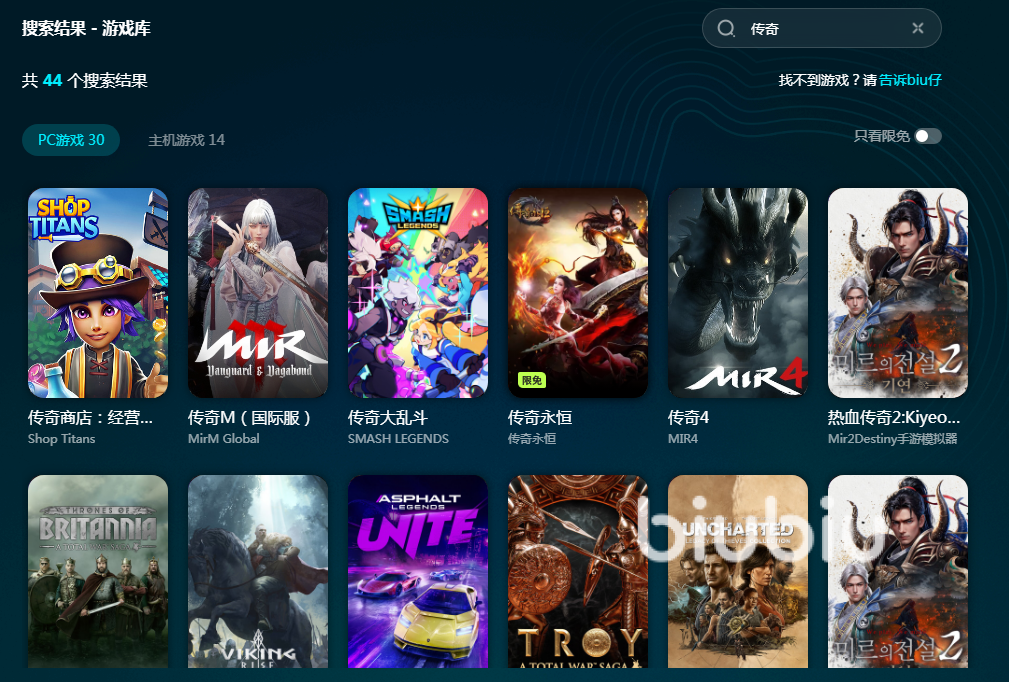 玩传奇端游怎么能少得了biubiu加速器呢,它本身就是专业的端游加速器,还能兼具手游、主机游戏的加速功能。现在在软件里可以搜到大量的传奇端游资源,只要注册成为新用户就能立马享受24小时免费加速,全部资源尽在掌握,轻松一点就能获得流畅的网速。