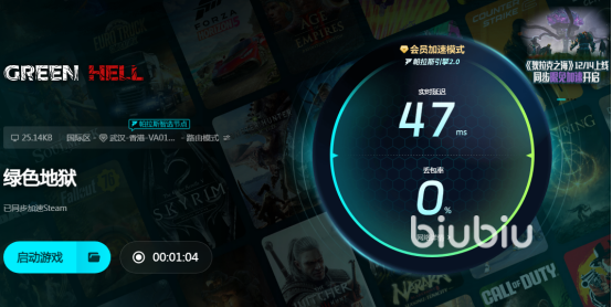 体验的过程中突然间卡死了,可能会让人非常自信,无法探索色彩斑斓的亚马逊雨林,更无法享受独特的机制。Biubiu满足你的种种需求及喜好,与专业电竞级加速工具丢包延迟等多种情况全部都能解决,即便体验的是外服游戏,选择国外服务器也不用为延迟过高而担忧可以将延迟率降低至100以下,还能将丢包率控制为0,长达8小时在线也足够稳定。