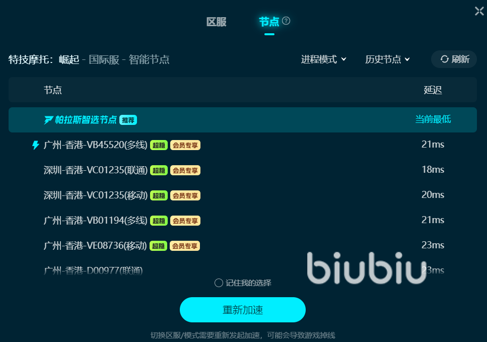 然后,进入biubiu,搜索“特技摩托崛起”的游戏名,点击加速,启动按钮一按,系统会根据你的地理位置和网络状况自动连上,精准又高效。整个过程超省心,启动速度快,连接稳定。