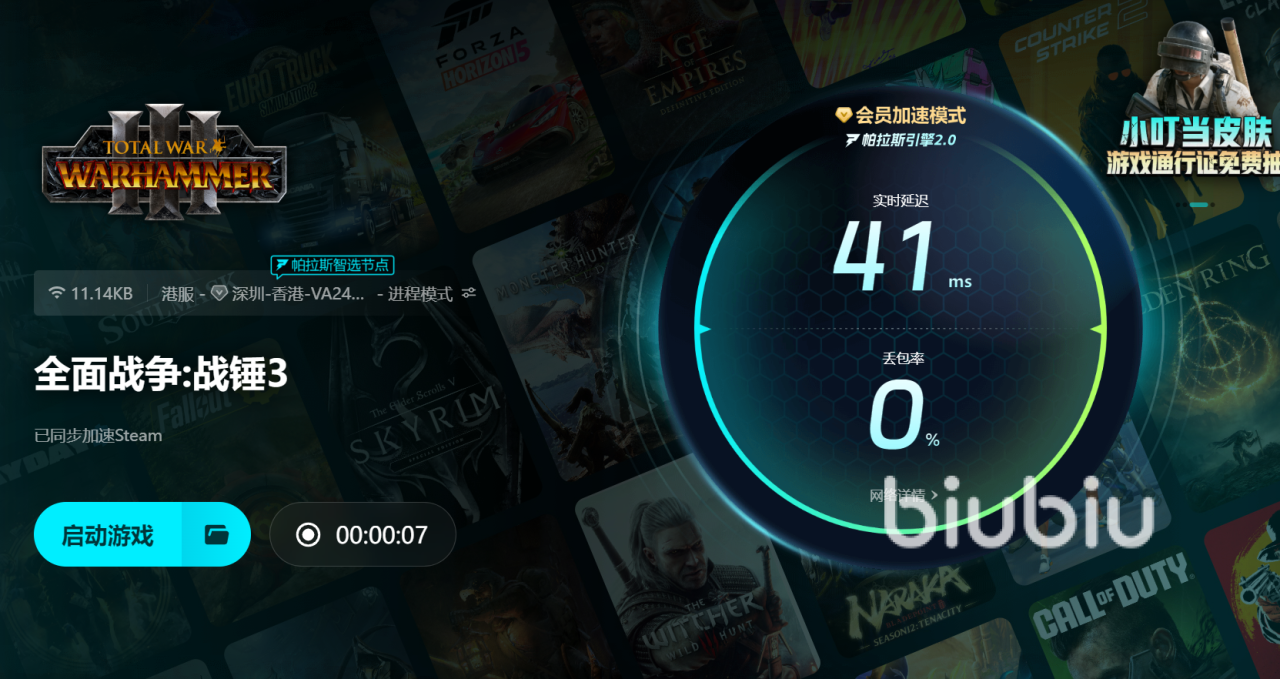 全面战争战锤如果是匹配时间卡在界面的话基本上就是内存和网速的问题,内存方面大概率就是玩家后台无用的界面是在是太多了,导致游戏的载入出现了重大问题,这时候清理网页内容就可以恢复了,网速方面的问题要等待服务器自行修复是较慢,但是使用biubiu就可以有效加速,让界面稳定状态,并且新人在注册后便获3小时免费加速,以及新老用户使用兑换码【biubiu不卡顿】可获3天免费的使用权哦!