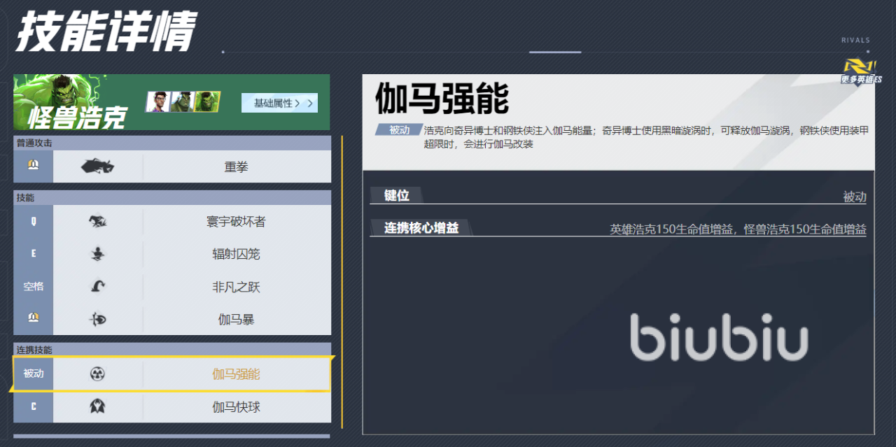 浩克:技能最为复杂了,有三个形态,班纳状态基础血量比较低,普攻就可以发射伽马射线子弹,变身成为英雄浩克基础血量翻倍成长,而且还可以给队友提供护盾,在怪兽浩克的状态下,还可以控住对手疯狂拳击,又控又能打。