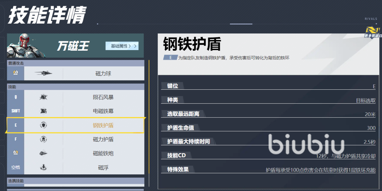 万磁王:他的强大之处就在于有很多防御技能,电磁铁幕可以阻挡周围的飞行物,美队的盾牌就能挡住,这样看就可以抵挡很多伤害了。钢铁护盾还可以给对手施加一个护盾,承受的伤害会转换成为背后的铁环,又能抗伤又帅气。