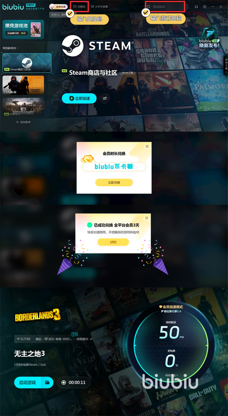 其实大家大可不用担心在运行中的存档问题,因为这款作品采用的是自动存档的模式,也就是在退出之前就可以自动保存。当不在任务中的时候,随时都能退出,这样自动保存下来,后续打开之后直接就能回到最近的存档,继续冒险,在做任务的时候,每完成一个剧情点,也会进行一次自动保存。在界面右下角会出现自动存档图标,大家及时观看注意一下就能发现。所以千万不用刻意去做,只要根据自己正常游戏节奏,往前推进主线就可以了。其实存档问题并不会过多影响体验,反而是运行不流畅令人头疼,biubiu就能解决这些问题。新注册号后直接就能免费试用3小时,这样的福利不容错过,另一项更加可观,用兑换码【biubiu不卡顿】去换72小时会员时间。
