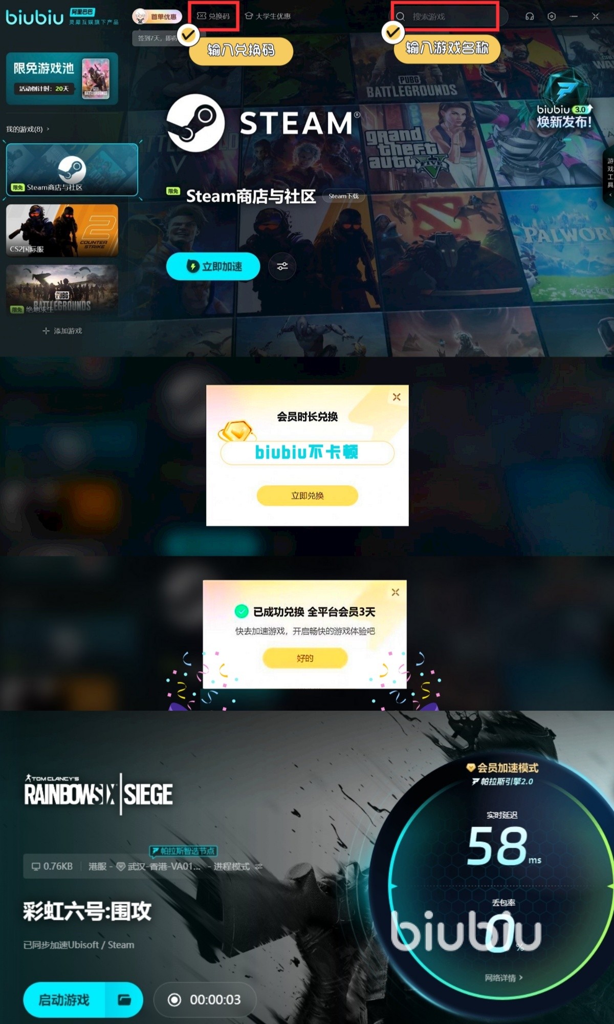 其中软件带来的福利也很多,比如广大新用户登陆时就可去领取3小时免费试用加速,这样就无须考虑充值方面顾虑,直接点击开启来感受它带来的出色性能,想要得到更多机会来加速不同游戏作品,只需利用【biubiu不卡顿】在兑换界面领取就能获得72h,这个还是十分给力的。
