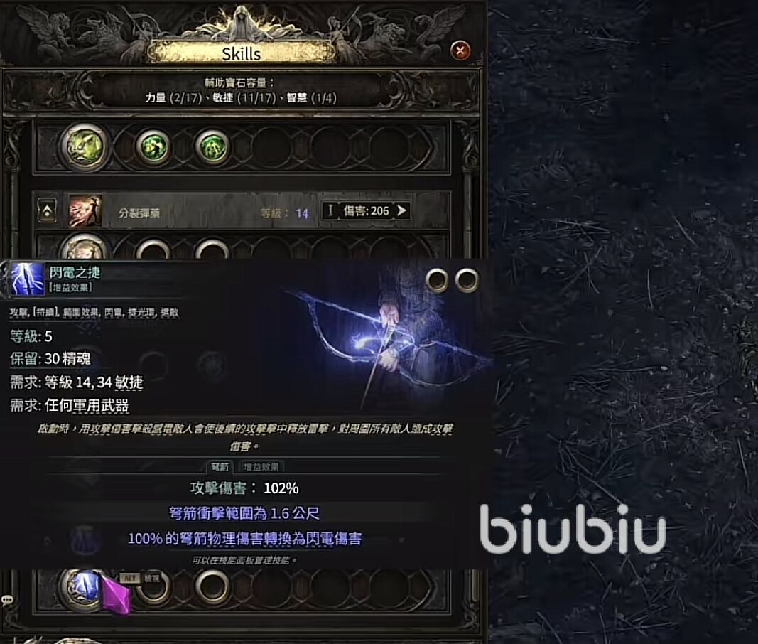 因为电喷前期就是攻速外加闪电伤害,因此接下来就可以考虑【毒气弹】,有瘟疫和衰败可以增加伤害,另外还有破甲值,对付可以减伤的boss是很有利的。只要站在远处射击,不需要看boss的状态给它一个破甲状态就可以逐步增伤了。其次是选择【电流投射】作为补充伤害的技能。在雷电填装CD较长时,它可以作为主场技能,配合雷电造成额外伤害。【闪电之捷】是一个十几级就可以获得的被动技能,它的作用是把弩箭的物理伤害转换为闪电伤害。这里就需要配合天赋中的【闪电伤害】12%增加了。电能伤害上再加一个【武器元素伤害】,有25%的闪电伤加成。