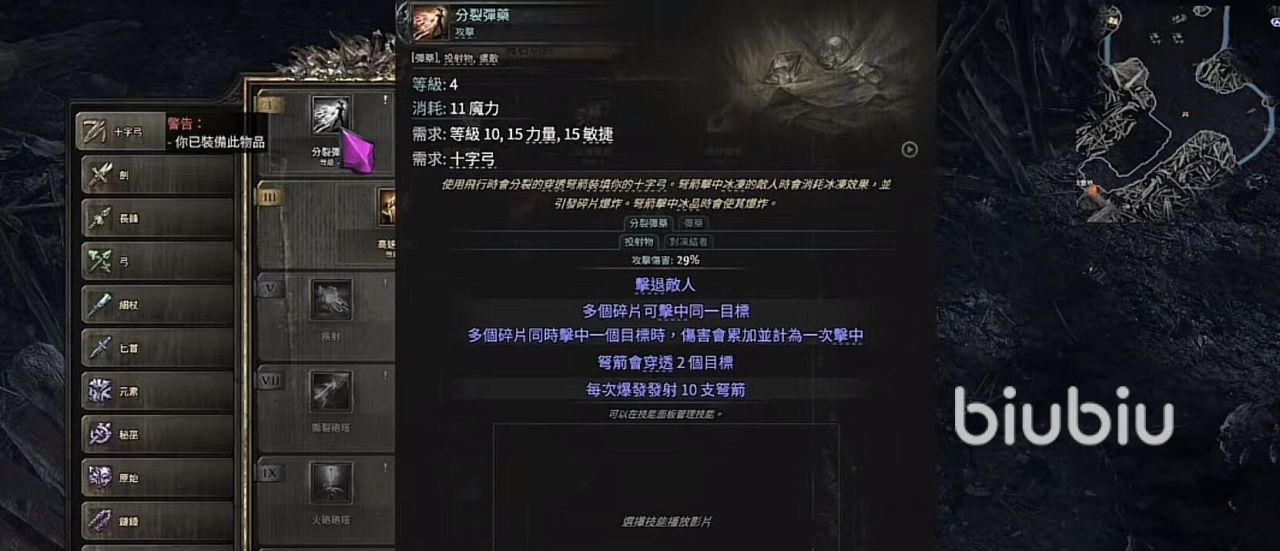 第二个技能我们选择【炸弹】。虽然它的引线时间较长,丢出去2.5秒才会炸,确实不好用,但其辅助技能宝石的【多重投射物】可以减少20%伤害的同时额外发射两支箭,伤害翻倍。前期配合双管喷子和【闪光弹】(3级技能宝石后就能学)来模拟炸弹的效果,一次可以炸3个,清群怪直接就秒了,对付Boss思路也很简单,【多重】移到【十字弓射击】上即可。