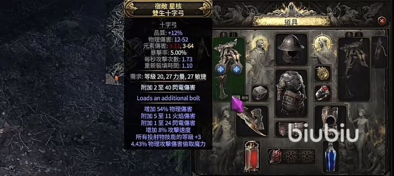 需要一把具有高闪电点伤的弩作为主武器。弩上的2个孔是主要的输出来源,镶嵌后数值是很可观的。另外词条要优先选择闪电和物理伤害,因为我们有100%的物理转闪电伤害的天赋。打造的话可以先选个好的底子,然后不停用崇高石去洗,洗到6条,再打2个孔,尽量打出高闪电点伤的词条。