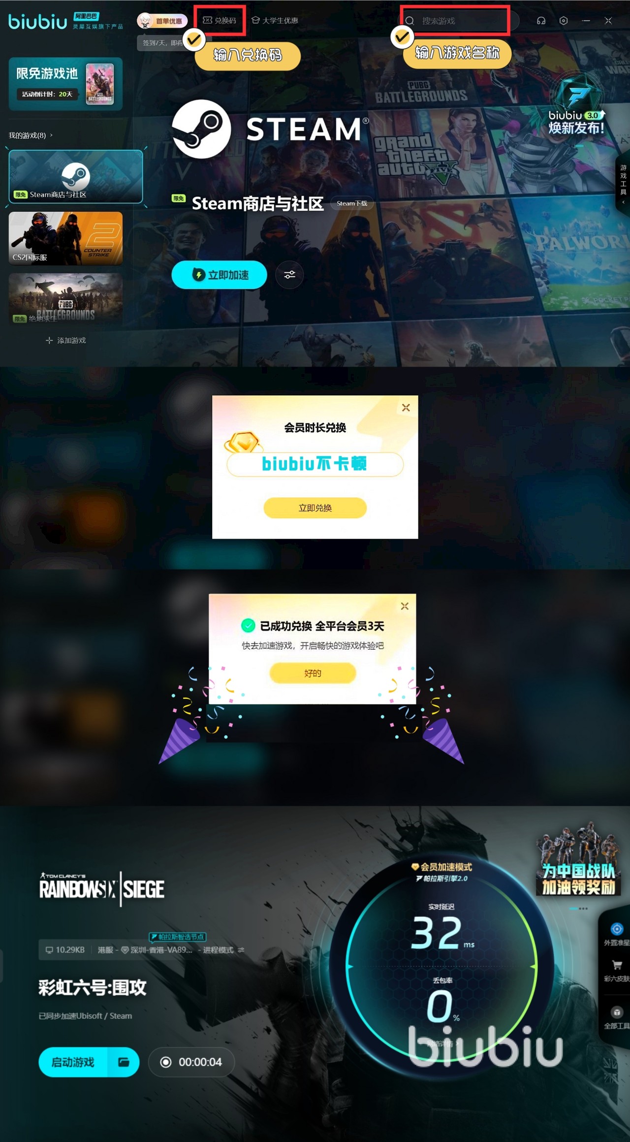 在玩的时候,大家可以试试用用提速软件,整体的战斗环境会提升不少,至于选择哪个好链接已经给大家分享出来了,这款应用对于新用户非常的友好,比如直接会给大家赠送3小时的体验时间,此外,新老用户还可以利用相关的兑换口令【biubiu不卡顿】到手三天的额外时间。