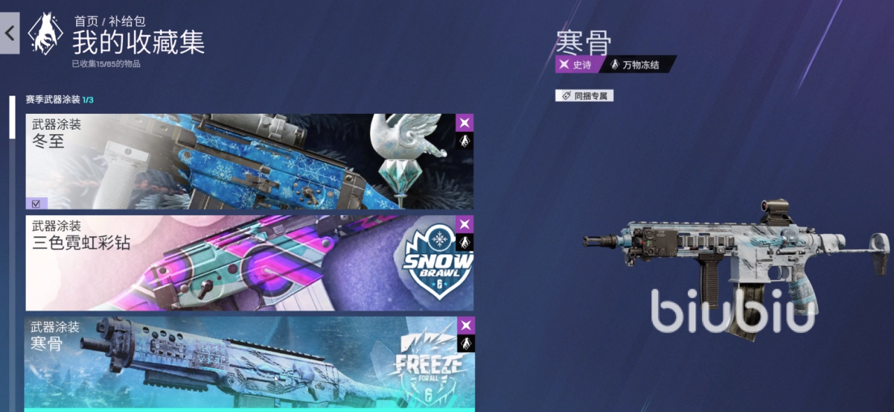 每个赛季,《彩虹六号:围攻》都会推出一系列赛季限定皮肤。这些皮肤通常都与季节主题紧密相关,比如冬季赛季的雪地迷彩皮肤,或者春季的花卉和绿色元素。每种季节皮肤的设计都极具特色,不仅视觉效果惊艳,还能够让你在战斗中独树一帜。最近的Y9S4赛季主题是万物冻结,推出一系列冰雪主题蓝色系的皮肤,比如有R4C皮肤 “破光”、武器涂装寒骨等。