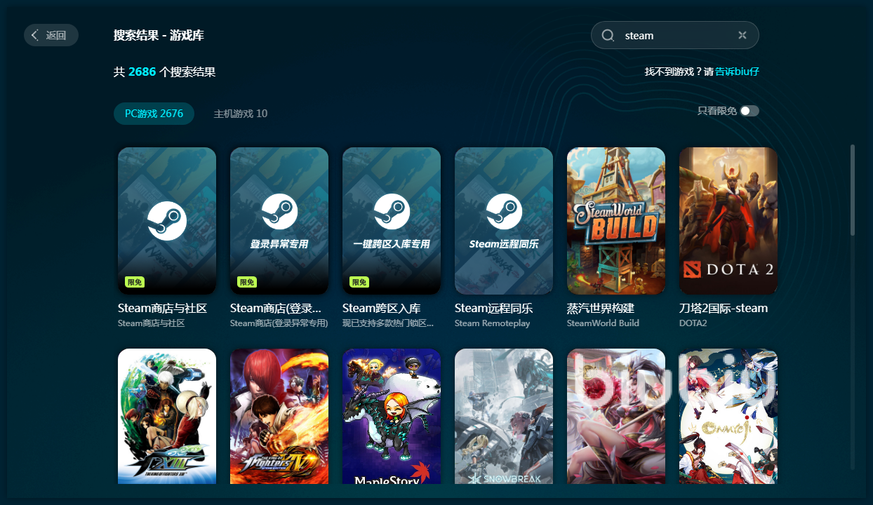 在biubiu中对steam进行操作非常简单,只需要输入名称后,就能看到有一系列相关选项,需要根据需求去进行选择,对于大多数玩家来说,发生问题都是在商店使用过程中,所以就去选择商店与社区选项,点击优化之后就在这里去打开steam,进行正常操作就行了。如果是其他的问题,就去选择对应的选项,例如跨区入库等或者是登录错误,都有解决办法。之所以需要biubiu,是因为现在很多国区玩家在使用steam时其实还是有着一定的物理壁垒,而biubiu就可以利用自身专线破除这些壁垒,这样自然就会轻松流畅很多,再加上自身专线所带来的优质网速,在biubiu中进行下载或者是更新,都会非常方便。