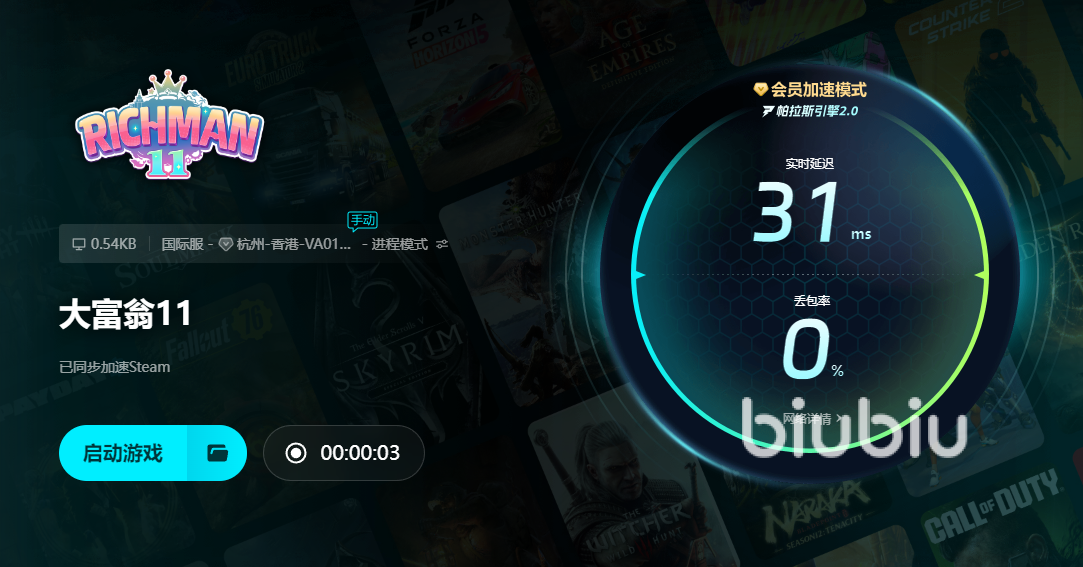 下载成功后打开biubiu,接着在页面中搜索大富翁11的名称,进入专区当中并点击开启加速,这时就不会出现无法加载的情况了。同时在页面的右侧,还可以看到当前的网络延迟有多少,甚至丢包率也可以进行实时监测。对于在海外或者使用其他区服的小伙伴们来说,biubiu也是一款很不错的软件。它能为非常多的区服进行网络优化,稳定好用的帕拉斯引擎2.0也是它的独家武器,能帮大家智能稳定地切换节点。