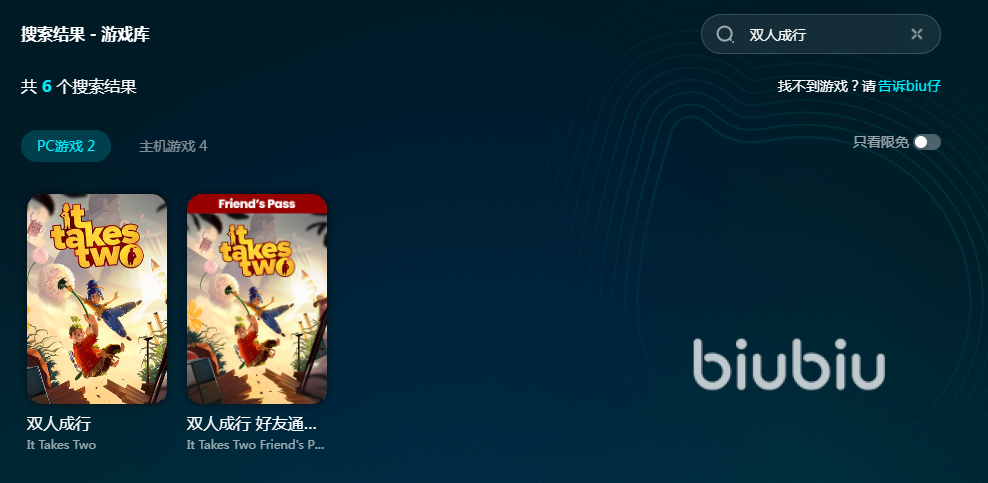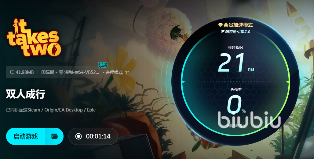 biubiu为用户准备了4款双人成行主机游戏限免加速,端游资源也是正规的可以放心用,一键启动以后系统自己分配节点,不管是玩哪个区服都能马上连接马上登录,而且进入游戏以后网速也是很稳定的,没有延迟更不会频繁卡顿。用户可以放心玩游戏,告别之前动不动就闪退的困扰,一口气通关不是梦想。