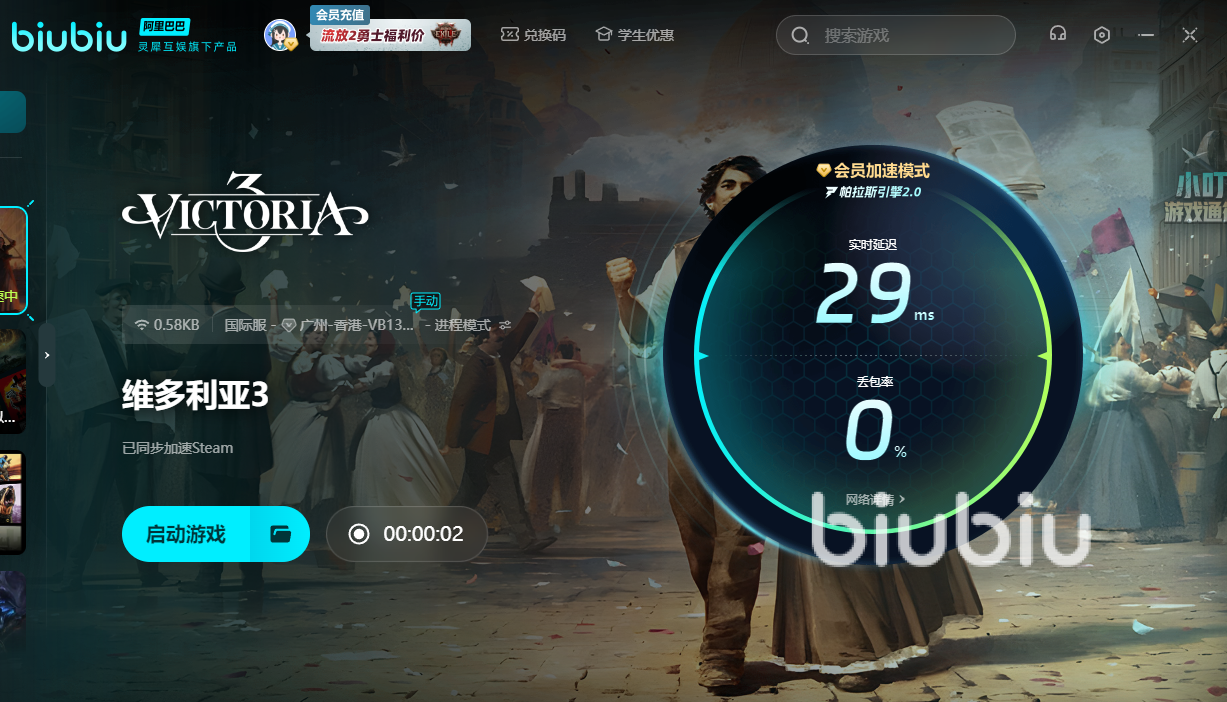 维多利亚3由于暂时还没有上线国服,所以大家想要与全球内的玩家一同角逐。最好利用好biubiu,才有能力坐上热气球来到这片全新的领土中。新用户的话可领取3小时的免费加速,此外新老用户可通过【biubiu不卡顿】,又能额外获得三天免费加速。不过在打造一些基建设施时太卡,就会让你的发育节奏变得缓慢。所以必须用上加速器,才能让你的参天大树能在短时间内打造而成。