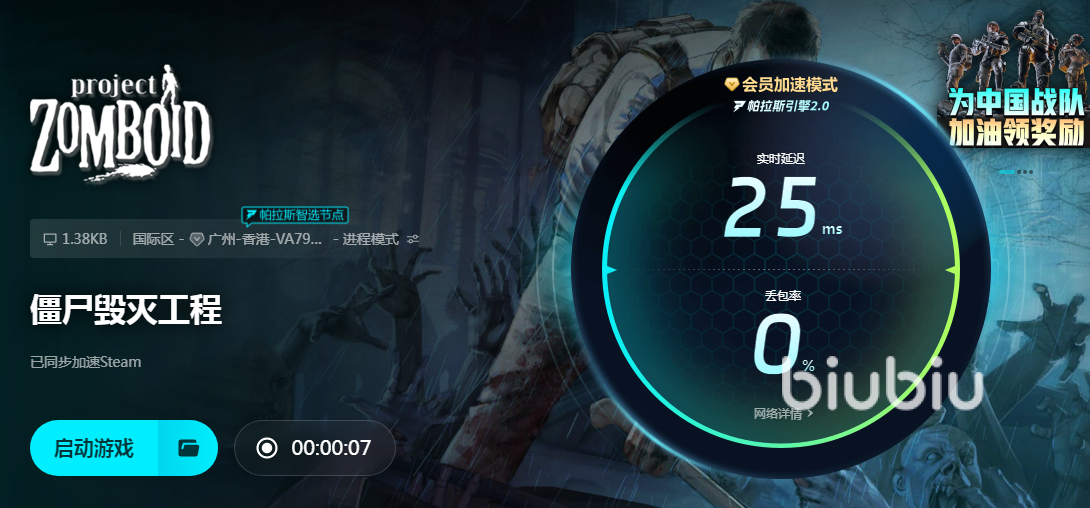 感觉网络不给力,赶紧呼叫biubiu来帮忙。在强大的游戏库里面找到僵尸毁灭工程,立马就能启动按钮加速了,使用方法真的特别简单。不需要用户选择节点,也没有多余的步骤,启动以后系统自己分配节点运行加速,让游戏快速连上服务器,还可以开启校园链式通道,就再也不担心玩游戏被弱网影响了。