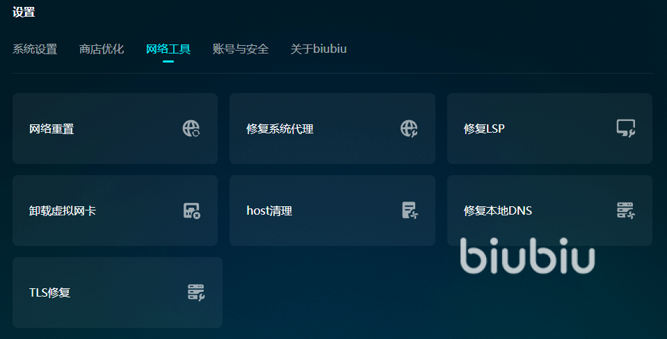 biubiu还有一个重要优势是它还可以改善电脑环境,它并不是一个单纯的加速软件,只提供单一的网络加速服务。而是准备了网卡修复、商店优化等多个功能,这些对用户的游戏体验都很有帮助,而且它们都是免费使用的,等于一个免费的电脑专家。