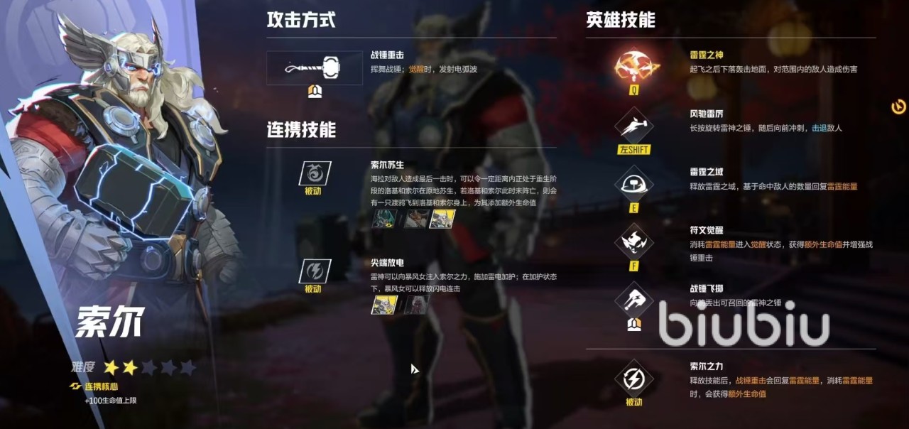 索尔自身的技能有以下几个,第1个雷霆之神,起飞之后攻击地面,对敌人造成范围伤害。第2个风驰雷历。通过长按旋转雷神之锤,随后向前冲刺将敌人击退。第3个雷霆之域,释放出雷霆之域,命中敌人数量越多,回复雷霆能量也就越高。第4个符文觉醒,消耗之前积攒的雷霆能量,进入到觉醒状态,获得额外生命值提升,并强化自身重击效果,也就是可以发射电弧波。第5个战锤飞投,向前丢出可以召回的雷神之锤。被动是索尔之力,在释放技能后,战锤重击将会恢复雷霆能量,消耗雷霆能量就能获得额外生命值。