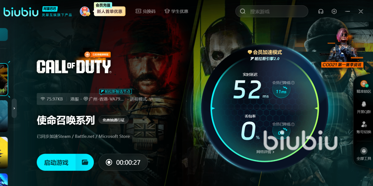 如果以及遇到了像音频不一致的问题,可以试试biubiu加速器,它的多点同传技术及高速专网保驾护航之下,解决网络导致的卡顿闪退均不在话下。各位还可以用新手机号注册账号,有3小时的试用VIP,还可享受【biubiu不掉线】兑换的72小时特权。加在一起就是超长的75小时了,足够打几次酣畅淋漓的高端对局。