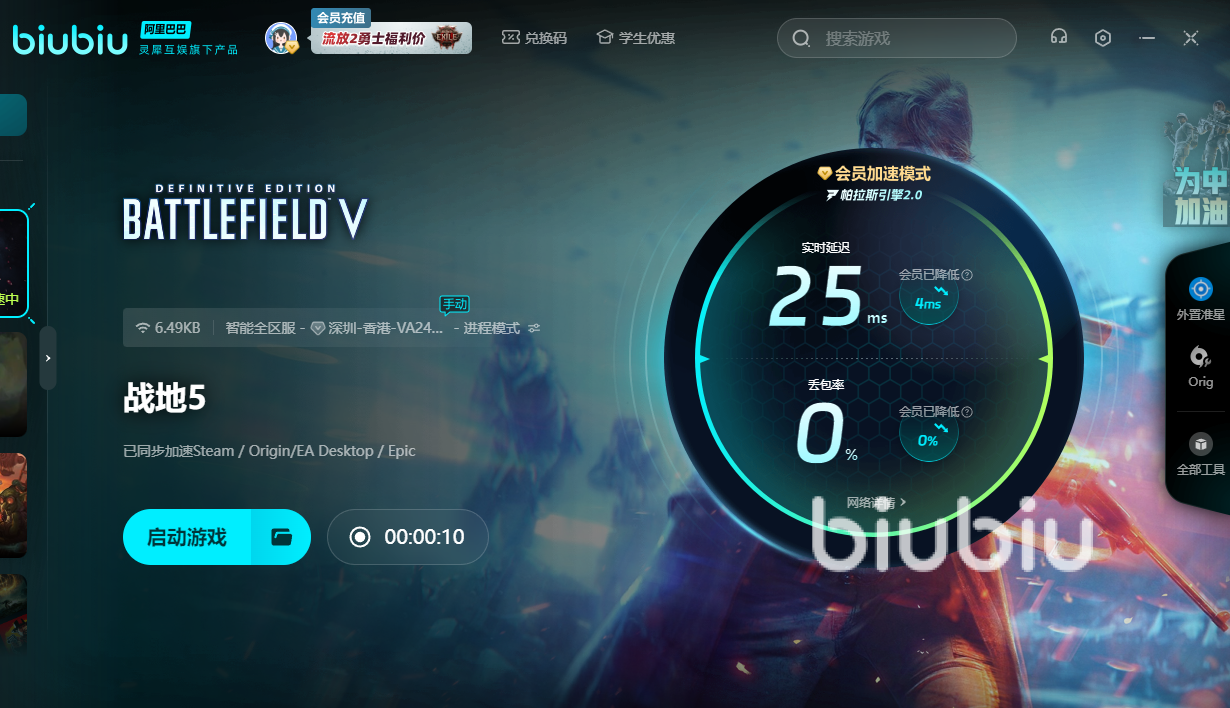 现在来说的话,战地5仍旧是个海外佳作,所以暂时还没上线国服。为了被直升机派遣至这个残酷的战场中,还得用上biubiu,才能突破敌军的围剿加入战争。新人的话可领取3小时的免费加速,此外新老用户通过【biubiu不卡顿】,额外获得三天免费加速。若是参与战争时太卡,就会不幸被突然出现的流弹所击中并阵亡。这时可用加速器,方能积极参与战争,无惧各种突发场面。