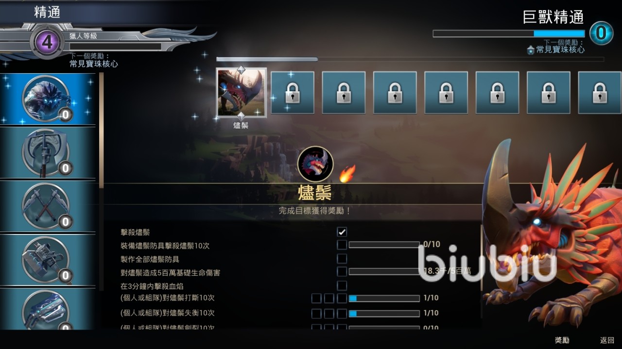 目前并没有正式的巨兽图鉴,不过每当玩家击败巨兽时都可以在精通界面的巨兽精通板块看到这个巨兽,击败的巨兽越多,巨兽精通这里显示的巨兽就越多,并且根据该页面下的内容去完成任务还能获取各种珍稀的资源奖励。