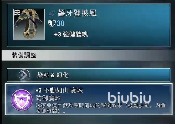 最后衣服的选择上可以用齧牙狸披風,它虽然没有额外的元素抗性,但强化三就可以给予三十防御,并且通过镶嵌不动如山宝珠还能防止被巨兽的攻击击倒,相当于提供了额外的容错。