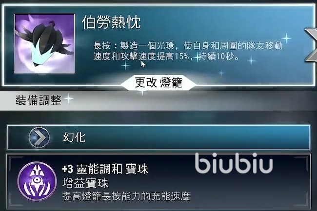 饰品可以选择伯劳热忱,它本身拥有主动效果,长按可以制造光环提升队友一段时间的攻速和移速,并且配备灵能调和宝珠还能加快充能速度。