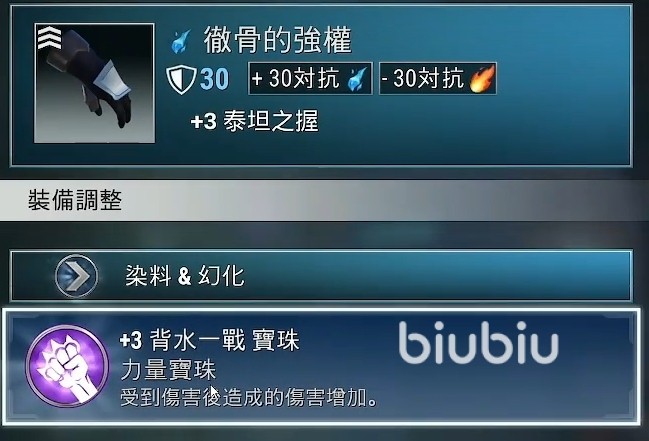 然后在手套上可以选择彻骨的强权,它提供三十防御,并且对冰属性攻击有额外的三十抗性,另外还可以通过搭配背水一战宝珠来提升自己受击后的伤害。